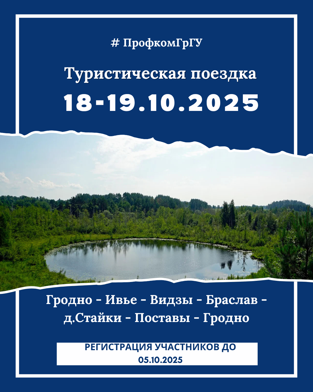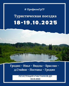Во исполнение плана работы первичной профсоюзной организации работников университета на второе полугодие 2025 года 18-19 октября 2025 года состоится туристическая поездка по маршруту Гродно-Ивье-Видзы-Браслав-дер.Стайки-Поставы-Гродно, посвященная 80-летию Великой Победы над немецко-фашистскими захватчиками.