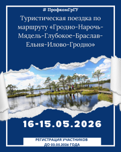В соответствии с планом первичной профсоюзной организации 16-17 мая 2026 года состоится туристическая поездка по маршруту Гродно-Нарочь-Мядель-Глубокое-Браслав-Ельня-Илово-Гродно